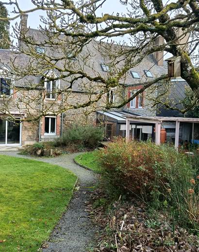 Un jardin entièrement clôturé ou le mélange fleurs, légumes, arbres fruitiers se côtoient tranquillement, chaises longues pour la farniente.
